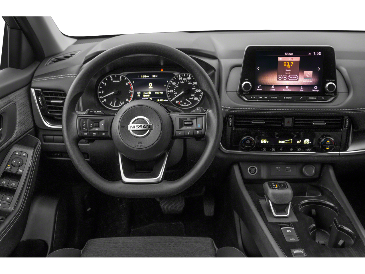 Stepping inside, you'll be surrounded by a wealth of premium amenities, including a heated leather-wrapped steering wheel, leatherette door trim inserts, and a panoramic moonroof that floods the cabin with natural light. The NissanConnect infotainment system with Apple CarPlay and Android Auto integration keeps you connected and entertained on every journey.